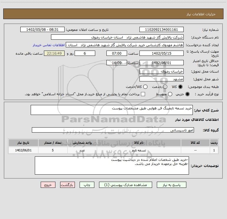 نام دستگاه خریدار:شرکت پالایش گاز شهید هاشمی نژاد استان خراسان رضوی