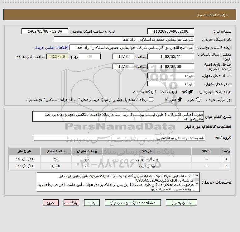 شرح کلی نیاز: صورت اجناس الکتریکال 1 طبق لیست پیوست از برند استاندارد،1350عدد، 250متر، نحوه و زمان پرداخت مالی:دو ماه