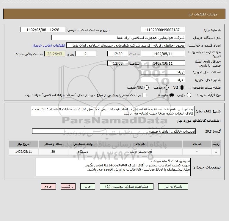 شرح کلی نیاز: آون ایرباس همراه با دسته و بدنه استیل در ابعاد طول 39عرض 22 عمق 39 تعداد طبقات 8 -تعداد : 50 عدد -کالای انتخاب شده صرفا جهت تشابه می باشد