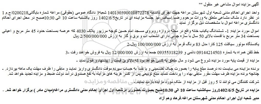 "آگهی مزایده اموال مشاعی غیر منقول "