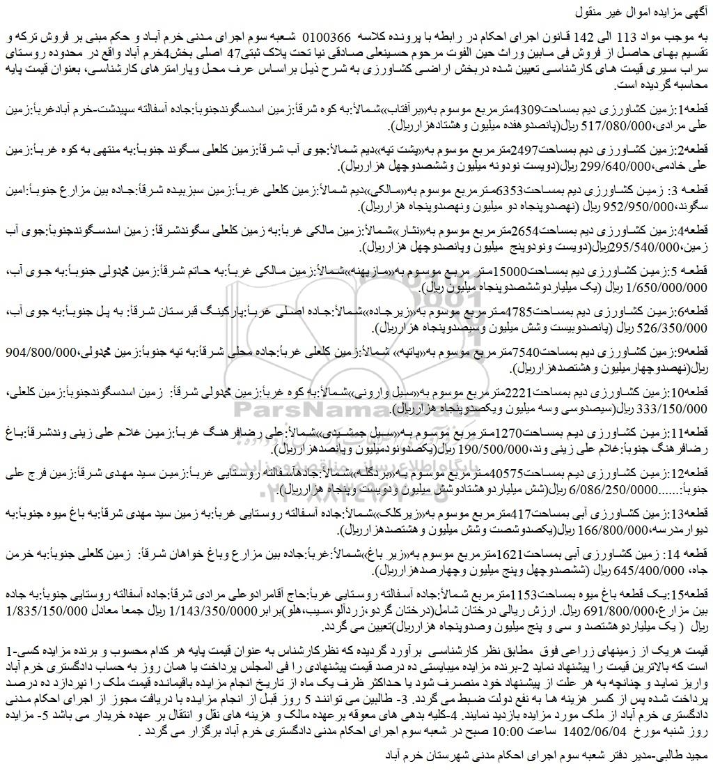 به موجب مواد 113 الی 142 قانون اجرای احکام در رابطه با پرونده کلاسه 0100366 شعبه سوم اجرای مدنی خرم آباد و حکم مبنی بر فروش ترکه و تقسیم بهای حاصل از فروش فی مابین وراث حین الفوت مرحوم حسینعلی صادقی نیا تحت پلاک ثبتی47 اصلی بخش4خرم آباد واقع در محدوده روستای سراب سیری قیمت های کارشناسی تعیین شده دربخش اراضی کشاورزی به شرح ذیل براساس عرف محل وپارامترهای کارشناسی، بعنوان قیمت پایه محاسبه گردیده است.
