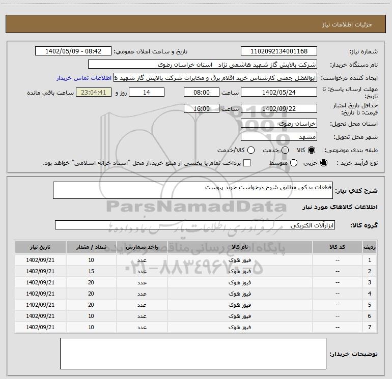 نام دستگاه خریدار:شرکت پالایش گاز شهید هاشمی نژاد استان خراسان رضوی