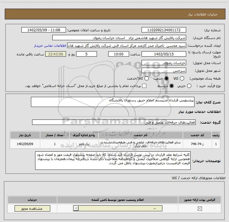 نام دستگاه خریدار:شرکت پالایش گاز شهید هاشمی نژاد استان خراسان رضوی