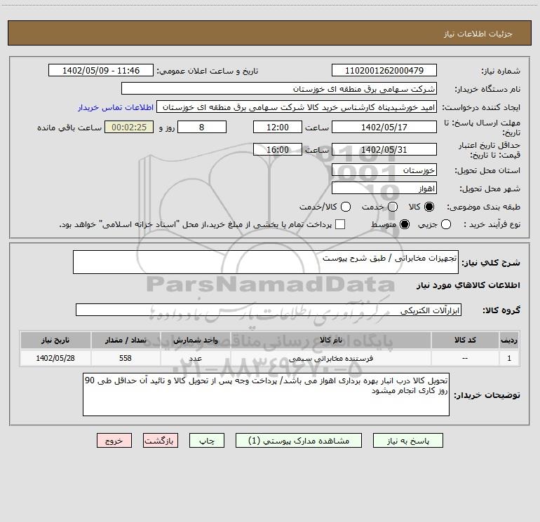 توضیحات خریدار:تحویل کالا درب انبار بهره برداری اهواز می باشد/ پرداخت وجه پس از تحویل کالا و تائید آن حداقل طی 90 روز کاری انجام میشود