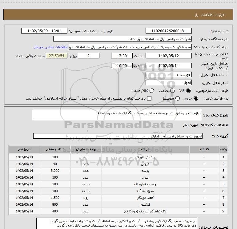 استعلام لوازم التحریر-طبق شرح ومشخصات پیوست بارگذاری شده درسامانه, استعلام لوازم التحریر-طبق شرح ومشخصات پیوست بارگذاری شده درسامانه