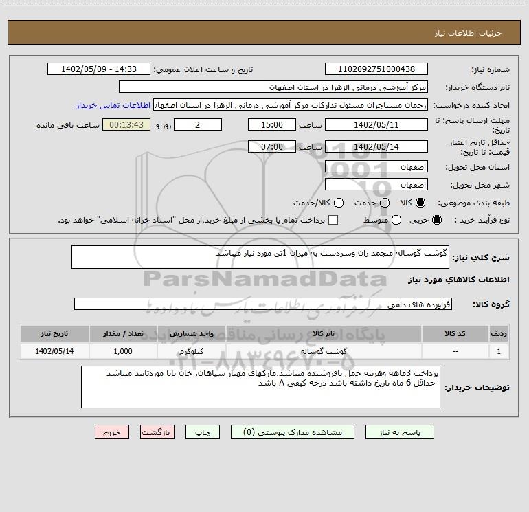 شرح کلی نیاز: گوشت گوساله منجمد ران وسردست به میزان 1تن مورد نیاز میباشد