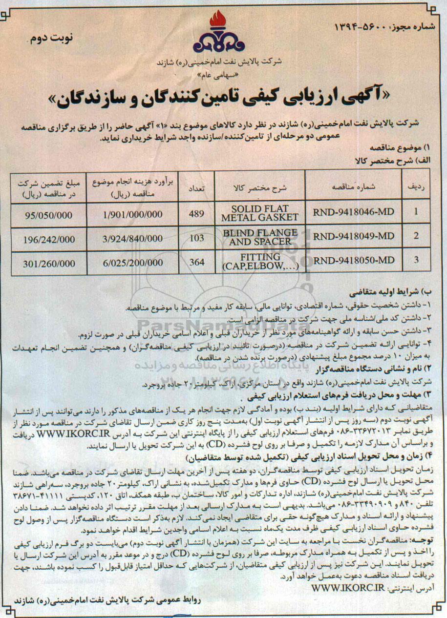 ارزیابی کیفی SOLID FLAT METAL GASKET...-نوبت دوم از کلیه افراد متخصص و شرکتها واجد شرایط دعوت به عمل میآید در مناقصه با کد خبرگزاری پارس نماد: 616135 شرکت نمایند.