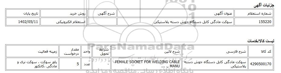 | 155220 | سوکت مادگی کابل دستگاه جوش دسته پلاستیکی | استعلام الکترونیکی | 1402/05/11 |