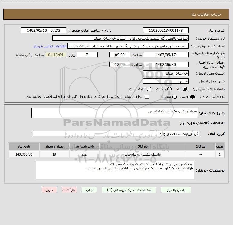 نام دستگاه خریدار:شرکت پالایش گاز شهید هاشمی نژاد استان خراسان رضوی