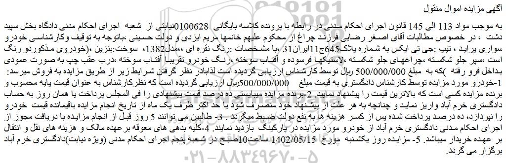 به موجب مواد 113 الی 145 قانون اجرای احکام مدنی در رابطه با پرونده کلاسه بایگانی 0100628نیابتی از شعبه اجرای احکام مدنی دادگاه بخش سپید دشت ، در خصوص مطالبات آقای اصغر رضایی فرزند چراغ از محکوم علیهم خانمها مریم ایزدی و دولت حسینی ،باتوجه به توقیف وکارشناسی خودرو سواری پراید ، تیپ :جی تی ایکس به شماره پلاک645ج11ایران31 ،با مشخصات :رنگ نقره ای ،،مدل1382، سوخت:بنزین ،(خودروی مذکوردو رنگ است ،سپر جلو شکسته ،چراغهای جلو شکسته ،لاستیکها فرسوده و آفتاب سوخته ،رنگ خودرو تقریبا آفتاب سوخته ،درب عقب چپ به صورت عمودی بداخل فرو رفته )که به مبلغ 500/000/000 ریال توسط کارشناس ارزیابی گردیده است لذابادر نظر گرفتن شرایط زیر از طریق مزایده به فروش میرسد: 1-خودرو مورد مزایده توسط کارشناس دادگستری به قیمت مبلغ 500/000/000ریال ارزیابی گردیده است که نظرکارشناس به عنوان قیمت پایه محسوب و برنده مزایده کسی است که بالاترین قیمت را پیشنهاد نمایید. 2-برنده مزایده میبایستی ده درصد قیمت پیشنهادی را فی المجلس پرداخت یا همان روز به حساب دادگستری خرم آباد واریز نماید و چنانچه به هر علت از پیشنهاد خود منصرف شود یا حد اکثر ظرف یک ماه از تاریخ انجام مزایده باقیمانده قیمت خودرو را نپردازد، ده درصد پرداخت شده پس از کسر هزینه ها به نفع دولت ضبط میگردد . 3- طالبین می توانند 5 روز قبل از انجام مزایده با دریافت مجوز از اجرای احکام مدنی دادگستری خرم آباد از خودرو مورد مزایده در پارکینگ بازدید نمایند. 4-کلیه بدهی های معوقه برعهده مالک و هزینه های نقل و انتقال بر عهده خریدار میباشد. 5- مزایده روز یکشنبه مورخ 1402/05/15 ساعت10صبح در شعبه پنجم اجرای احکام مدنی (ویژه نیابت)دادگستری خرم آباد برگزار می گردد.