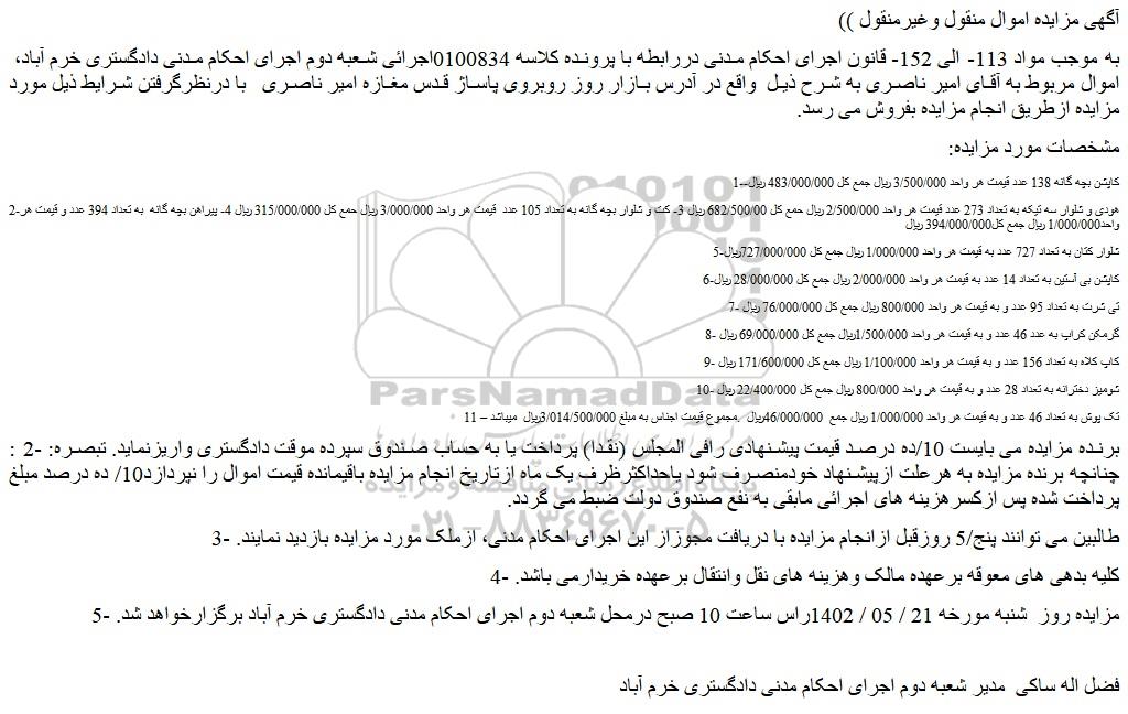 به موجب مواد 113- الی 152- قانون اجرای احکام مدنی دررابطه با پرونده کلاسه 0100834اجرائی شعبه دوم اجرای احکام مدنی دادگستری خرم آباد، اموال مربوط به آقای امیر ناصری به شرح ذیل واقع در آدرس بازار روز روبروی پاساژ قدس مغازه امیر ناصری با درنظرگرفتن شرایط ذیل مورد مزایده ازطریق انجام مزایده بفروش می رسد.