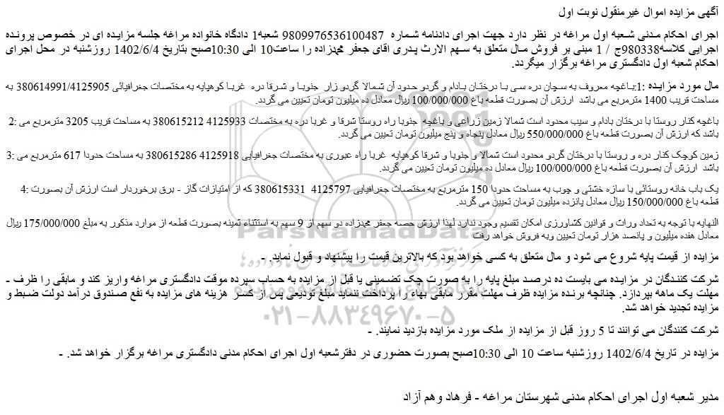 اجرای احکام مدنی شعبه اول مراغه در نظر دارد جهت اجرای دادنامه شماره  9809976536100487 شعبه1 دادگاه خانواده مراغه جلسه مزایده ای در خصوص پرونده اجرایی کلاسه980338ج / 1 مبنی بر فروش مال متعلق به سهم الارث پدری اقای جعفر محمدزاده را ساعت10 الی 10:30صبح بتاریخ 1402/6/4 روزشنبه در محل اجرای احکام شعبه اول دادگستری مراغه برگزار میگردد.