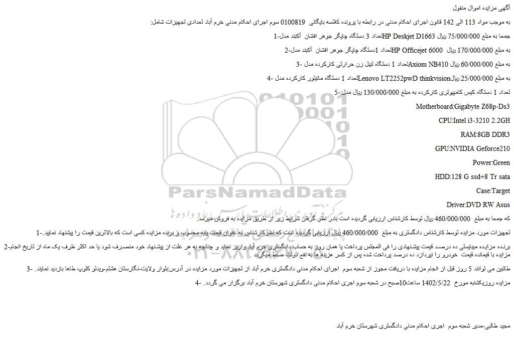 به موجب مواد 113 الی 142 قانون اجرای احکام مدنی در رابطه با پرونده کلاسه بایگانی 0100819 سوم اجرای احکام مدنی خرم آباد تعدادی تجهیزات شامل: