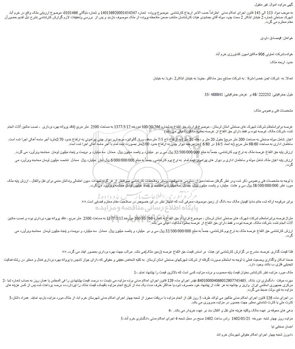 به موجب مواد 113 الی 145 قانون اجرای احکام مدنی احتراماً حسب الامر ارجاع کارشناسی موضوع پرونده شماره 140136920001454347 و شماره بایگانی 0101466، موضوع ارزیابی ملک واقع در خرم آباد شهرک صنعتی شماره 2 خیابان ابتکار 2 سمت چپ، سوله آقای جمشیدی هیات کارشناسان منتخب ضمن ملاحظه پرونده از ملک موصوف بازدید و پس از بررسی وتحقیقات لازم گزارش کارشناسی بشرح ذیل تقدیم حضورآن مقام محترم می گردد.