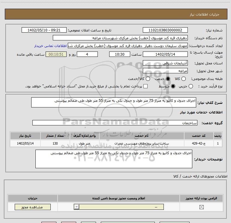 شرح کلی نیاز: اجرای جدول و کانیو به متراژ 75 متر طول و جدول تکی به متراژ 55 متر طول طی ضمائم پیوستی
