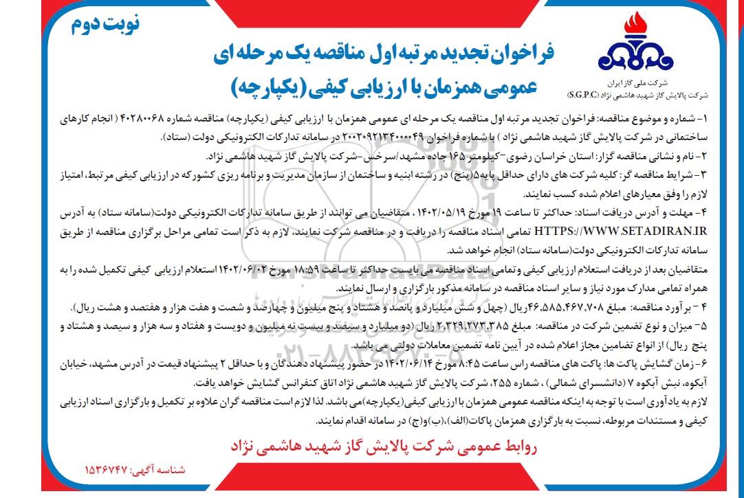 شماره موضوع مناقصه: فراخوان تجدید مرتبه اول مناقصه یک مرحله ای عمومی همزمان با ارزیابی کیفی یکپارچه مناقصه شماره 40280068 (انجام کارهای ساختمانی در شرکت پالایش گاز شهید هاشمی نژاد) با شماره فراخوان 2002092134000049 در سامانه تدارکات الکترونیکی دولت ستاد