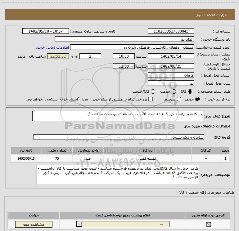شرح کلی نیاز: جا کفشی پلاستیکی 5 طبقه تعداد 70 عدد - نمونه کار بپیوست میباشد./