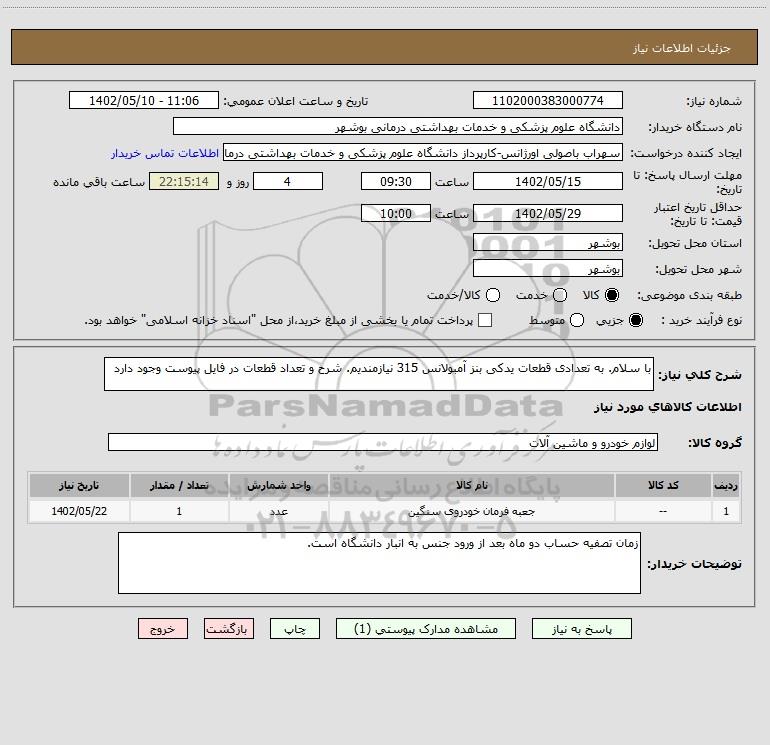 شرح کلی نیاز: با سلام. به تعدادی قطعات یدکی بنز آمبولانس 315 نیازمندیم. شرح و تعداد قطعات در فایل پیوست وجود دارد