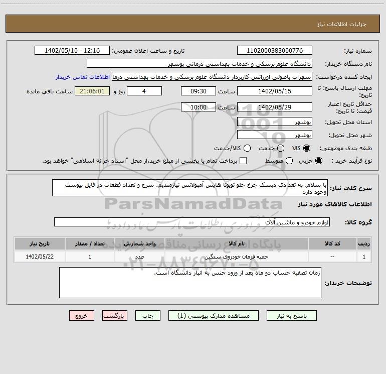 شرح کلی نیاز: با سلام. به تعدادی دیسک چرخ جلو تویوتا هایس آمبولانس نیازمندیم. شرح و تعداد قطعات در فایل پیوست وجود دارد