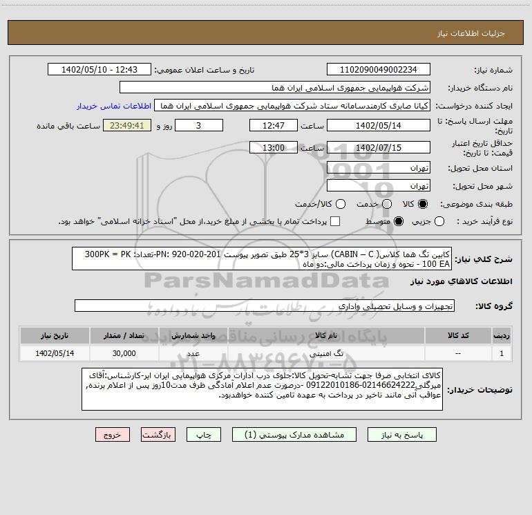 شرح کلی نیاز: کابین تگ هما کلاس( CABIN – C) سایز 3*25 طبق تصویر پیوست PN: 920-020-201-تعداد: 300PK = PK 100 EA - نحوه و زمان پرداخت مالی:دو ماه