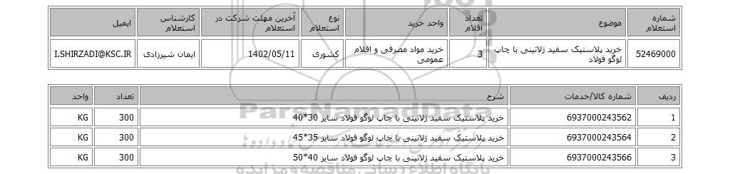 | 3 | 6937000243566 | خرید پلاستیک سفید ژلاتینی با چاپ لوگو فولاد سایز 40*50 | 300 | KG |