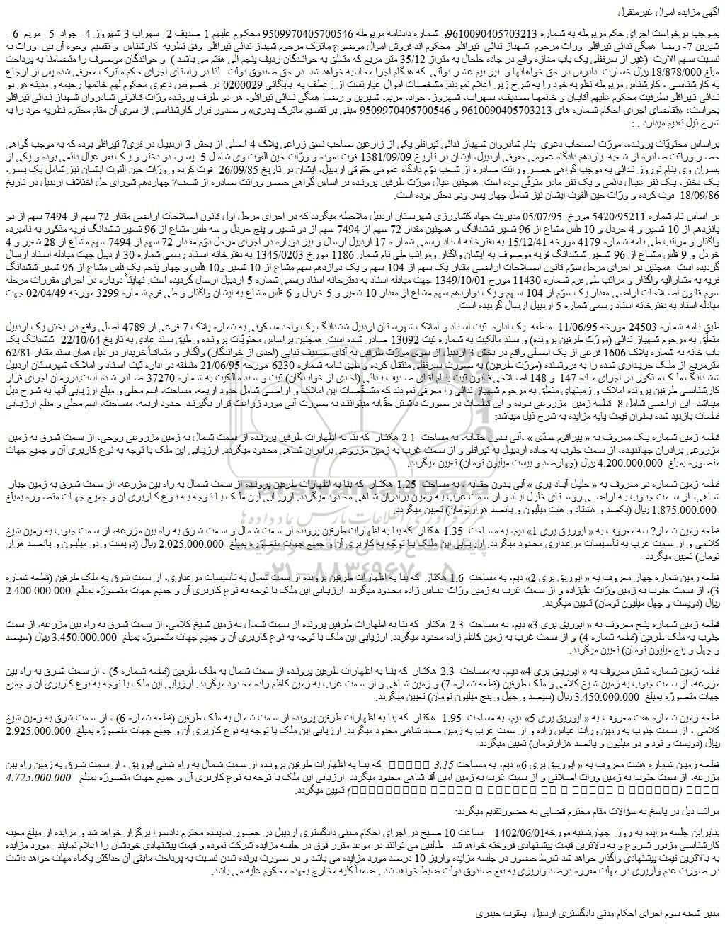 طبق نامه شماره 24503 مورخه 11/06/95 منطقه یک اداره ثبت اسناد و املاک شهرستان اردبیل ششدانگ یک واحد مسکونی به شماره پلاک 7 فرعی از 4789 اصلی واقع در بخش یک اردبیل متعلّق به مرحوم شهباز ندائی (مورّث طرفین پرونده) و سند مالکیت به شماره ثبت 13092 صادر شده است. همچنین براساس محتویّات پرونده و طبق سند عادی به تاریخ 22/10/64 ششدانگ یک باب خانه به شماره پلاک 1606 فرعی از یک اصلی واقع در بخش 3 اردبیل از سوی مورّث طرفین به آقای صدیف ندایی (احدی از خواندگان) واگذار و متعاقباً خریدار در ذیل همان سند مقدار 62/81 مترمربع از ملک خریداری شده را به فروشنده (مورّث طرفین) به صورت سرقفلی منتقل کرده و طبق نامه شماره 6230 مورخه 21/06/95 منطقه دو اداره ثبت اسناد و املاک شهرستان اردبیل ششدانگ ملک مذکور در اجرای ماده 147 و 148 اصلاحی قانون ثبت بنام آقای صدیف ندائی (احدی از خواندگان) ثبت و سند مالکیت به شماره 37270 صادر شده است.درزمان اجرای قرار کارشناسی طرفین پرونده املاک و زمینهای متعلق به مرحوم شهباز ندائی را معرفی نمودند که مشخّصات این املاک و اراضی شامل حدود اربعه، مساحت، اسم محلی و مبلغ ارزیابی آنها به شرح ذیل میباشد. این اراضی شامل 8 قطعه زمین مزروعی بوده و این قطعات در صورت داشتن حقّابه میتوانند به صورت آبی مورد زراعت قرار بگیرند. حدود اربعه، مساحت، اسم محلی و مبلغ ارزیابی قطعات بازدید شده بعنوان قیمت پایه مزایده به شرح ذیل میباشد: