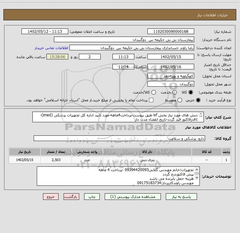 شرح کلی نیاز: دبش های مورد نیاز بخش ivf طبق پیوست-پرداخت4ماهه-مورد تایید اداره کل تجهیزات پزشکی (imed)-