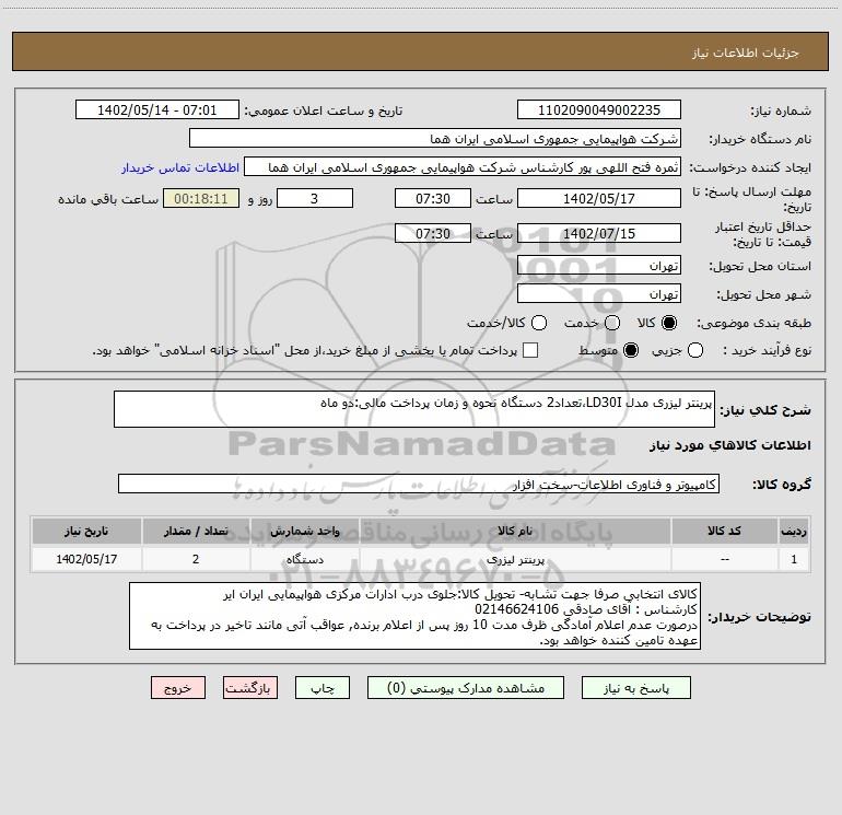 شرح کلی نیاز: پرینتر لیزری مدل LD30I،تعداد2 دستگاه نحوه و زمان پرداخت مالی:دو ماه