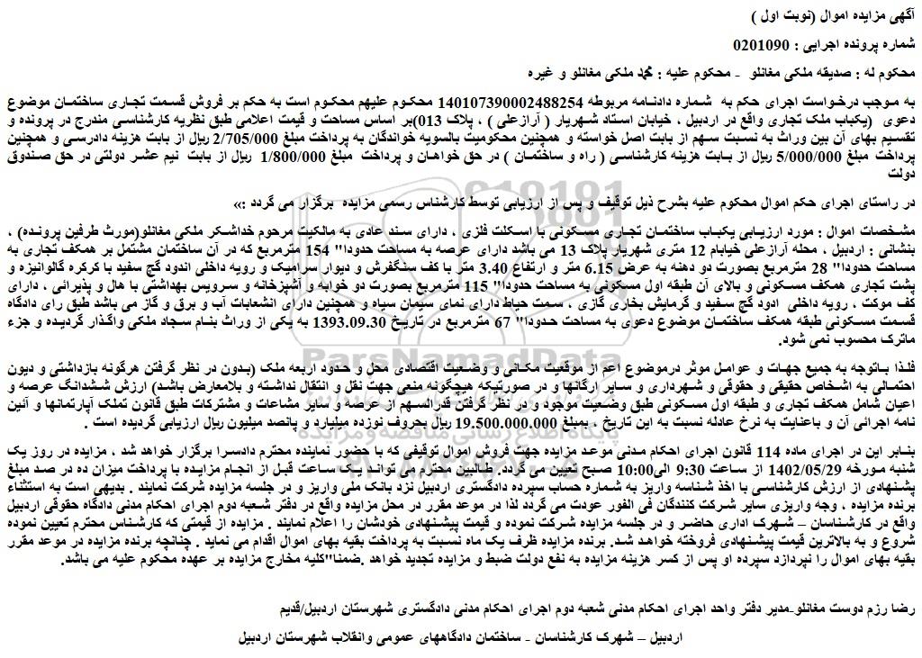 به موجب درخواست اجرای حکم به  شماره دادنامه مربوطه 140107390002488254 محکوم علیهم محکوم است به حکم بر فروش قسمت تجاری ساختمان موضوع دعوی  (یکباب ملک تجاری واقع در اردبیل ، خیابان استاد شهریار ( آرازعلی ) ، پلاک 013)بر اساس مساحت و قیمت اعلامی طبق نظریه کارشناسی مندرج در پرونده و تقسیم بهای آن بین وراث به نسبت سهم از بابت اصل خواسته و همچنین محکومیت بالسویه خواندگان به پرداخت مبلغ 2/705/000 ریال از بابت هزینه دادرسی و همچنین پرداخت مبلغ 5/000/000 ریال از بابت هزینه کارشناسی ( راه و ساختمان ) در حق خواهان و پرداخت  مبلغ 1/800/000  ریال از بابت  نیم عشر دولتی در حق صندوق دولت