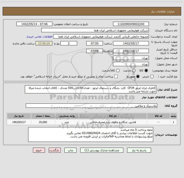 شرح کلی نیاز: کاتلری ایران ایرتور CP34 کارد ،چنگال و دستمال ایرتور - تعداد:50کارتن500 عددی - کالای انتخاب شده صرفا جهت تشابه می باشد