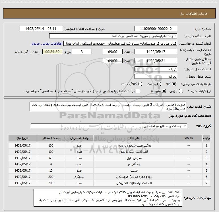 شرح کلی نیاز: صورت اجناس الکتریکال 3 طبق لیست پیوست از برند استاندارد-تعداد:طبق لیست پیوست-نحوه و زمان پرداخت مالی:10 روزه