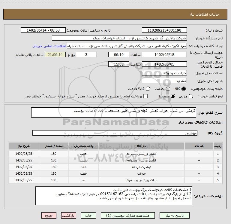 نام دستگاه خریدار:شرکت پالایش گاز شهید هاشمی نژاد استان خراسان رضوی