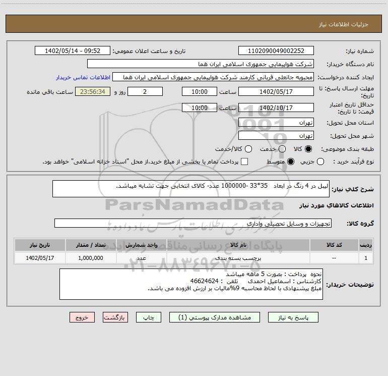 شرح کلی نیاز: لیبل در 4 رنگ در ابعاد 35*33 -1000000 عدد- کالای انتخابی جهت تشابه میباشد.