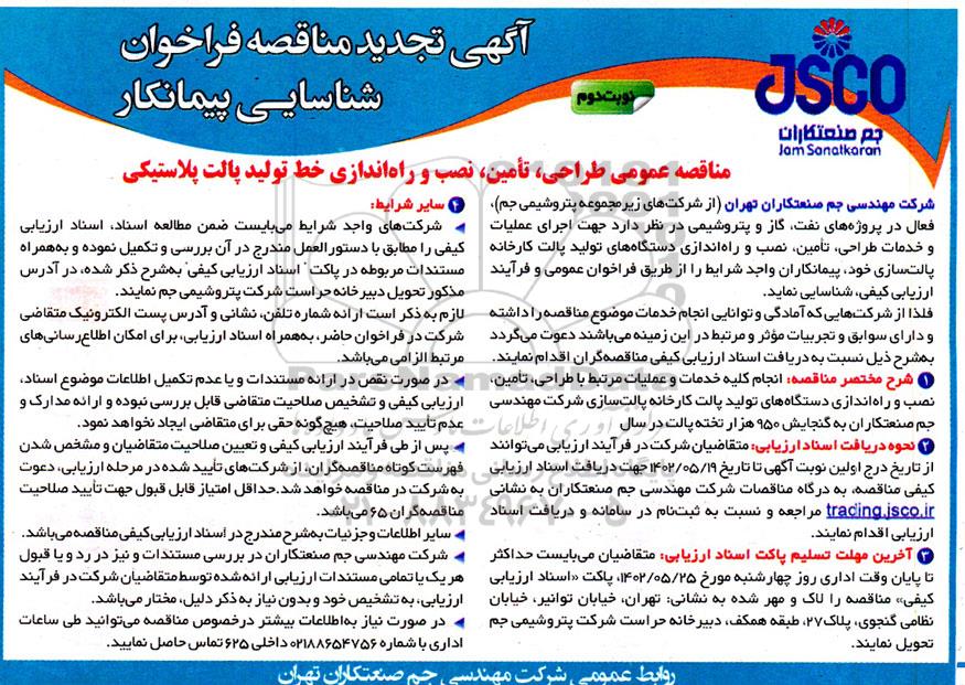 شرکت مهندسی جم صنعتکاران تهران (از شرکتهای زیر مجموعه پتروشیمی جم) فعال در پروژه های نفت و گاز و پتروشیمی در نظر دارد جهت اجرای عملیات و خدمات طراحی ، تامین ، نصب و راه اندازی دستگاه های تولید پالت کارخانه پالت سازی خود پیمانکاران واجد شرایط را از طریق فراخوان عمومی و فرایند ارزیابی کیفی شناسایی نماید