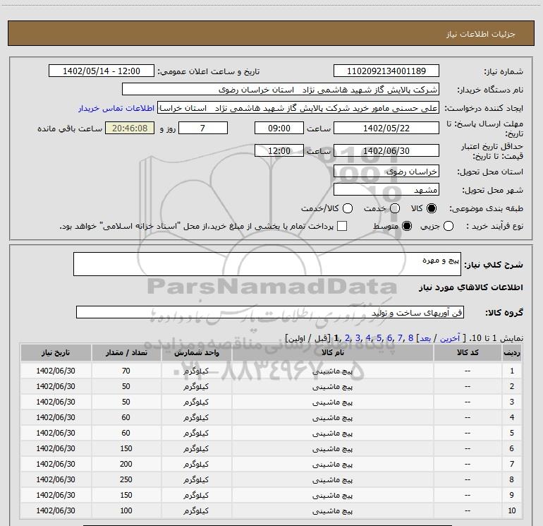 نام دستگاه خریدار:شرکت پالایش گاز شهید هاشمی نژاد استان خراسان رضوی
