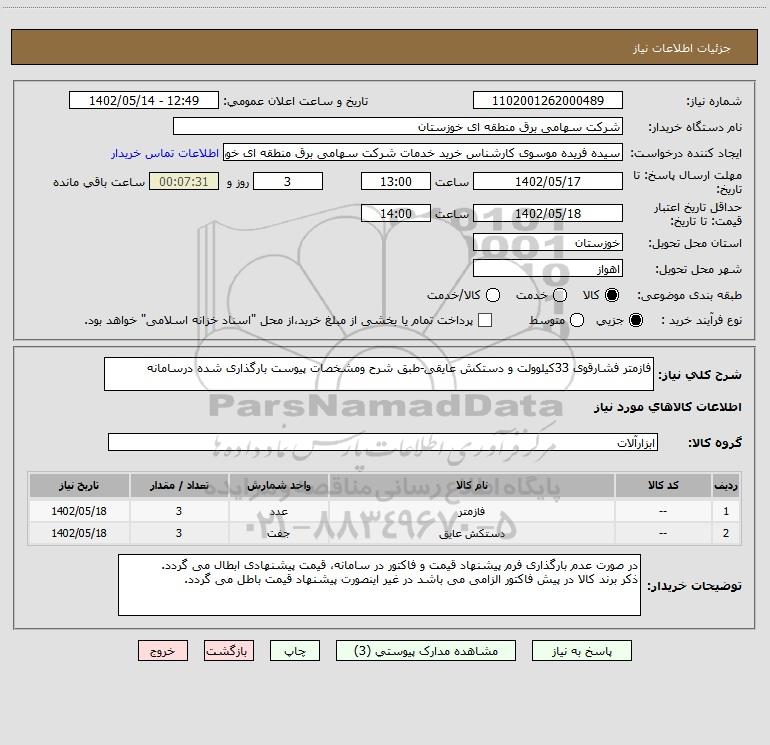 شرح کلی نیاز: فازمتر فشارقوی 33کیلوولت و دستکش عایقی-طبق شرح ومشخصات پیوست بارگذاری شده درسامانه