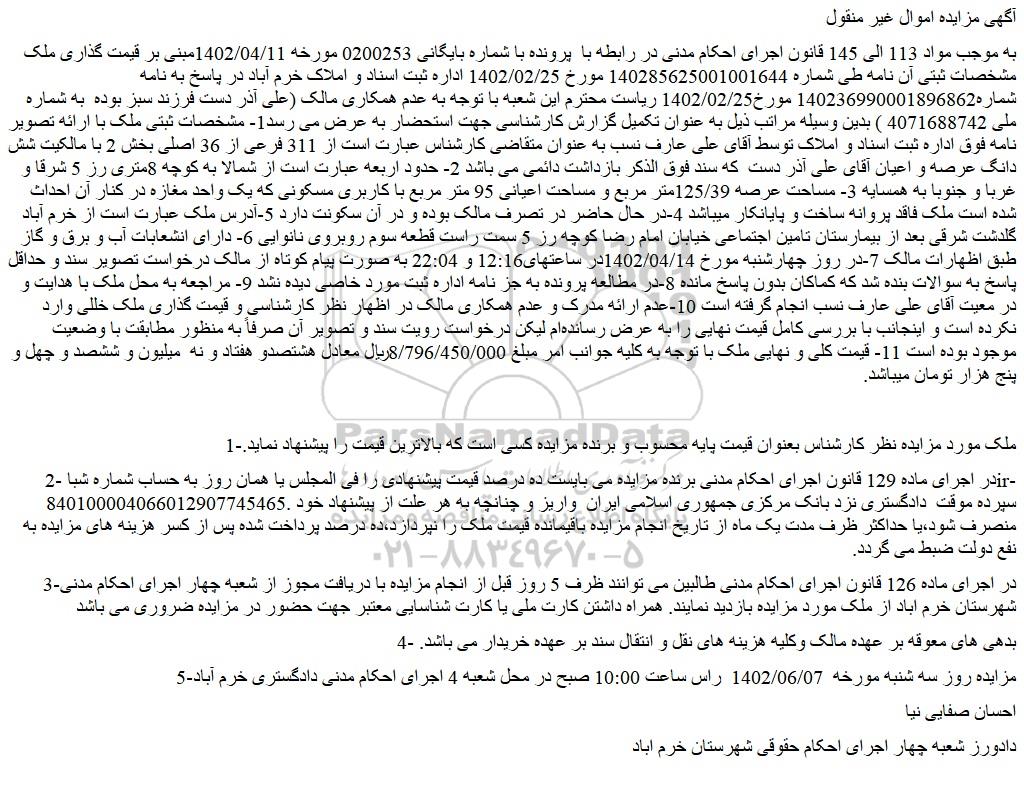 5-مزایده روز سه شنبه مورخه 1402/06/07 راس ساعت 10:00 صبح در محل شعبه 4 اجرای احکام مدنی دادگستری خرم آباد