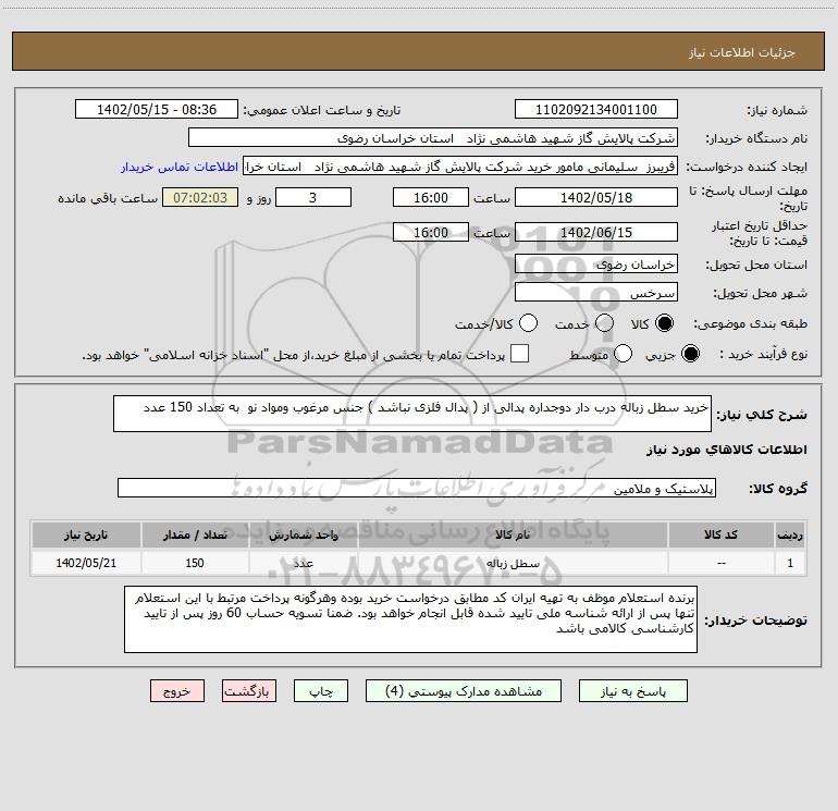 شرح کلی نیاز: خرید سطل زباله درب دار دوجداره پدالی از ( پدال فلزی نباشد ) جنس مرغوب ومواد نو به تعداد 150 عدد