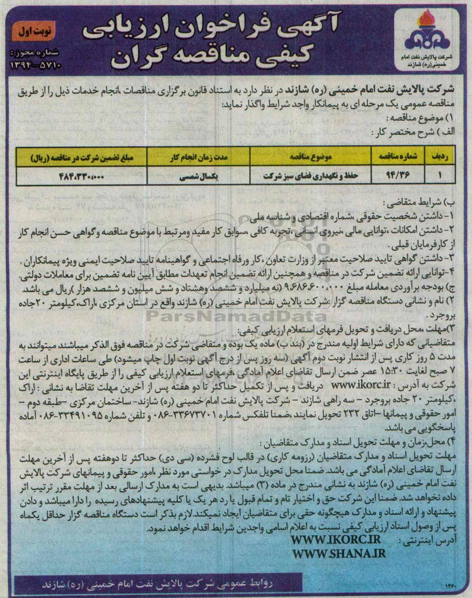 فراخوان ارزیابی حفظ و نگهداری فضای سبز شرکت , فراخوان ارزیابی , فراخوان ارزیابی حفظ و نگهداری فضای سبز شرکت نوبت اول