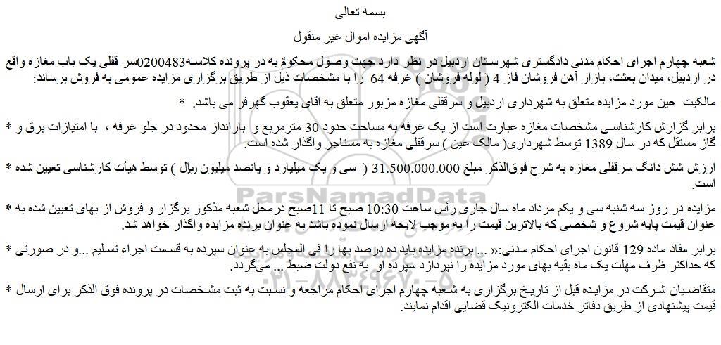 شعبه چهارم اجرای احکام مدنی دادگستری شهرستان اردبیل در نظر دارد جهت وصول محکومٌ به در پرونده کلاسه0200483سر قفلی یک باب مغازه واقع در اردبیل، میدان بعثت، بازار آهن فروشان فاز 4 ( لوله فروشان ) غرفه 64  را با مشخصات ذیل از طریق برگزاری مزایده عمومی به فروش برساند: