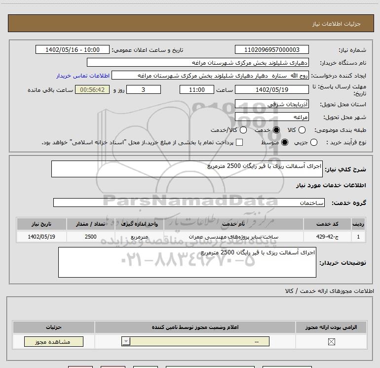 شرح کلی نیاز: اجرای آسفالت ریزی با قیر رایگان 2500 مترمربع