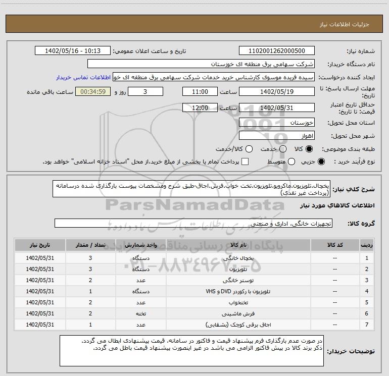 شرح کلی نیاز: یخچال.تلویزیون.ماکرویو.تلویزیون.تخت خواب.فرش.اجاق-طبق شرح ومشخصات پیوست بارگذاری شده درسامانه (پرداخت غیر نقدی)