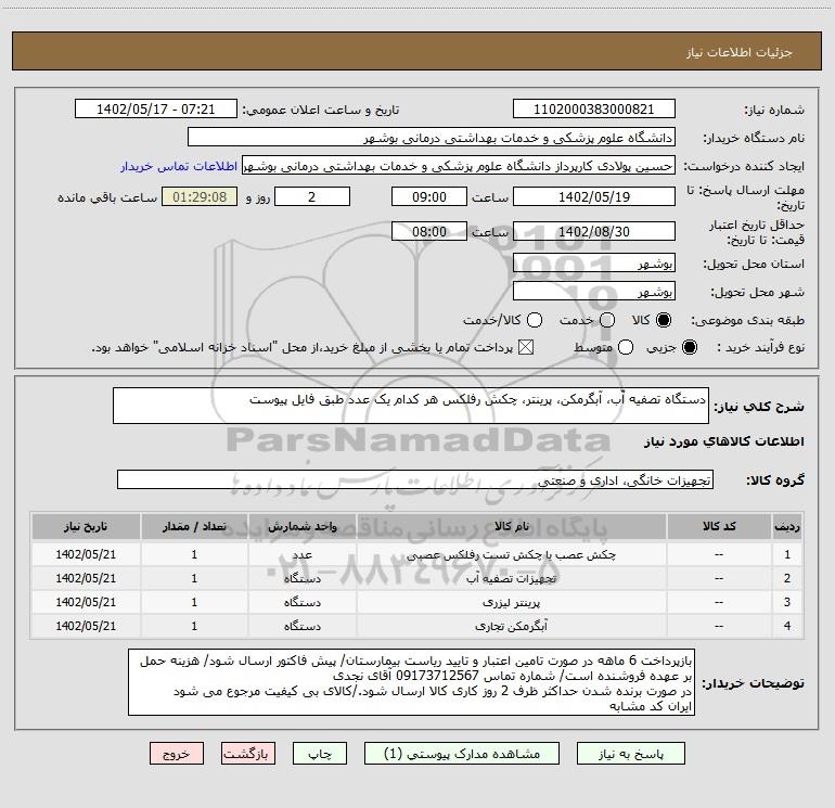 شرح کلی نیاز: دستگاه تصفیه آّب، آبگرمکن، پرینتر، چکش رفلکس هر کدام یک عدد طبق فایل پیوست