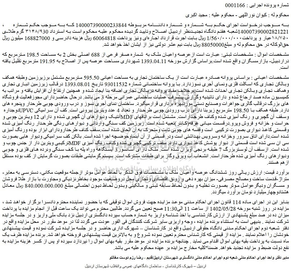 ، به موجب درخواست اجرای حکم به شماره و شماره دادنامه مربوطه 140007390000233844 که به موجب حکم شماره 140007390002821221شعبه هفتم دادگاه تجدیدنظر اردبیل اصلاح وتایید گردیده محکوم علیه محکوم است به استرداد ۳۱۴۸/۹30 گرم طلای ۱۸/۷۵۰عیار و پرداخت1/56۰/۰۰۰/۰۰۰ ریال بابت اجرت قرارداد اجاره ای ونیز پرداخت 60064818 ریال هزینه دادرسی و 168827000 میلیون ریال حق الوکاله در حق محکوم له و مبلغ88050000 ریال بابت نیم عشر دولتی نیز از ایشان اخذ خواهد شد.
