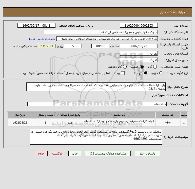 شرح کلی نیاز: بازسازی نمای ساختمان انبار مواد شیمیایی هما،ایران کد انتخاب شده صرفا جهت تشابه می باشد.بازدید شنبه 05/21