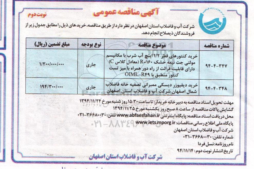 94-4-348 خرید دیفیوزر دیسکی ممبرانی تصفیه خانه فاضلاب شمال اصفهان شرکت آب و فاضلاب استان اصفهان جاری 194.300.000