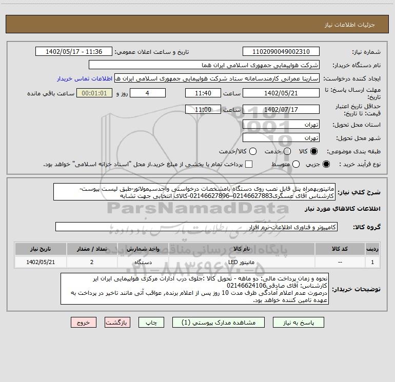 شرح کلی نیاز: مانیتوربهمراه پنل قابل نصب روی دستگاه بامشخصات درخواستی واحدسیمولاتور-طبق لیست پیوست-کارشناس آقای عسگری02146627883–02146627896-کالای انتخابی جهت تشابه