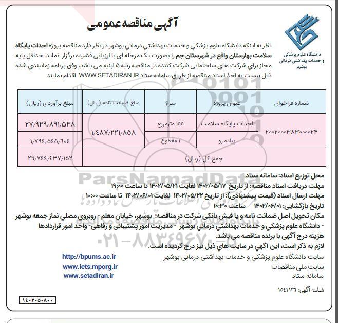 نظر به اینكه دانشگاه علوم پزشكی و خدمات بهداشتی درمانی بوشهر در نظر دارد مناقصه پروژه احداث پایگاه سلامت بهارستان واقع در شهرستان جم را به صورت یک مرحله ای با ارزیابی فشرده برگزار نماید . حداقل پایه مجاز برای شرکتهای ساختمانی شرکت کننده در مناقصه رتبه 5 ابنیه می باشد ، وفق برنامه زمانبندی شده ذیل نسبت به اخذ اسناد مناقصه از طریق سامانه ستاد اقدام نمایند.