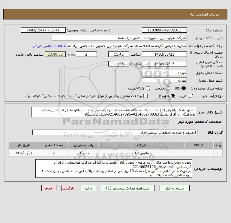 شرح کلی نیاز: مانیتور به همراه پنل قابل نصب روی دستگاه بامشخصات درخواستی واحدسیمولاتور-طبق لیست پیوست-هماهنگی با آقای عسگری02146627883–02146627896-تعداد 2دستگاه