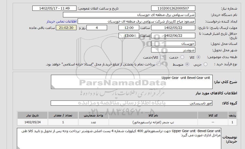 توضیحات خریدار:Upper Gear unit -Bewel Gear unit جهت ترانسفورماتور 400 کیلوولت شماره 4 پست اصلی شوشتر -پرداخت وجه پس از تحویل و تایید کالا طی مراحل اداری صورت می گیرد